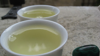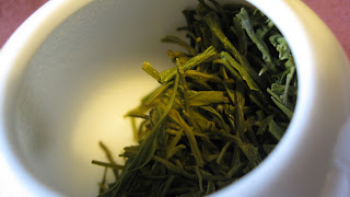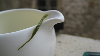 The rainy-stormy weather today seems really fine to brew this tea. Because Lu Shan Yun Wu has something warm and comforting, compared to most green teas. The dry leaves offer a deep green color with silvery shimmer. The very delicate down is not easily visible on the dry leaves, but when you brew, you can see it in suspension in the water.